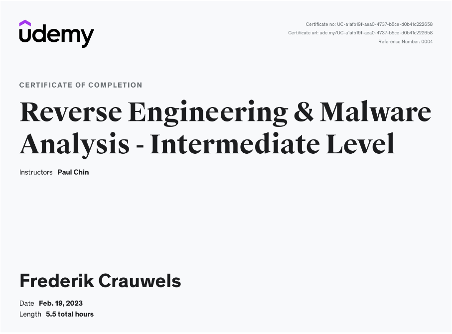 These certifications were part of a course called Professional Skils 3, which was meant to extend our knowledge and become a professional in preparation for graduation. As i have chosen to perform an internship related to malware analysis, i wanted to prepare for this moment already. These two certificates are both beginner- and advanced level by the same instructor. It allowed me to understand how i can perform malware analysis in a custom environment and obtain a head start during my internship. Some of my learning points included: